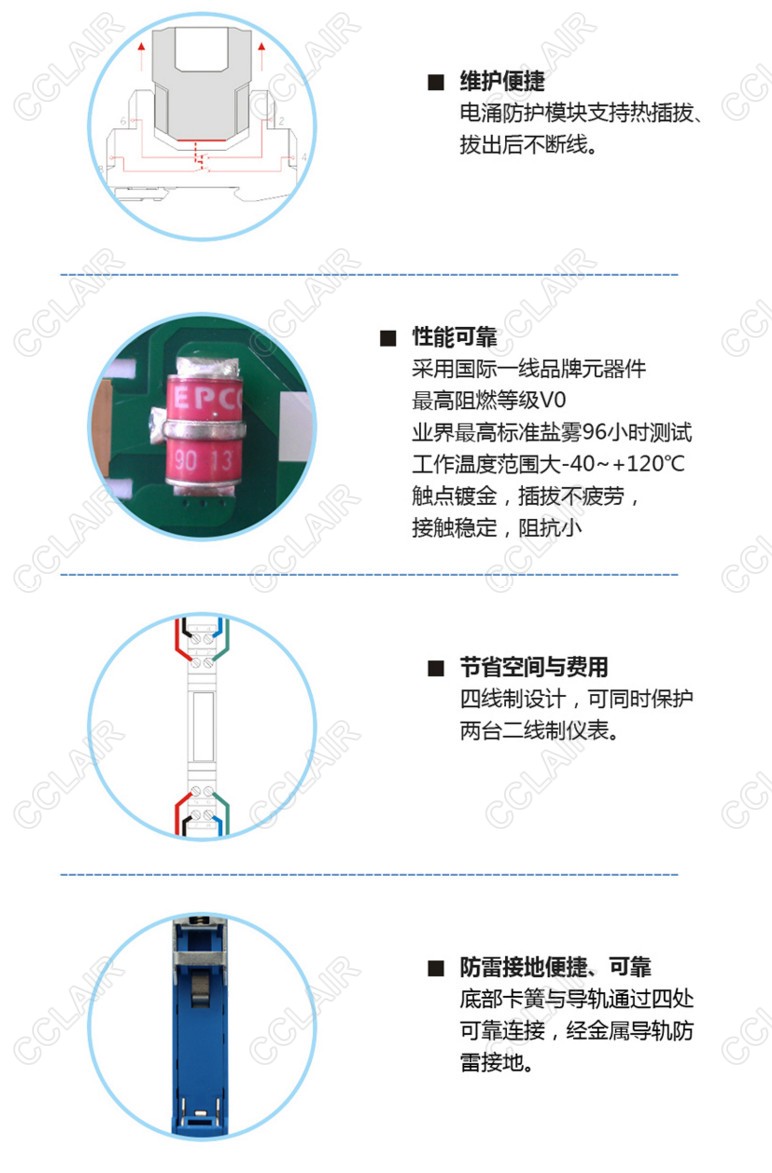 24VDC電源SPD,適合24VDC、電磁閥等電源回路,最大放電電流Imax(8/20us):20kA/線,12.5mm超薄,通過DIN35金屬導(dǎo)軌接地。
