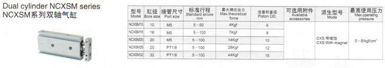 詳細(xì)信息 NCXSM10,NCXSM16,NCXSM20,NCXSM25,NCXSM32,雙軸氣缸