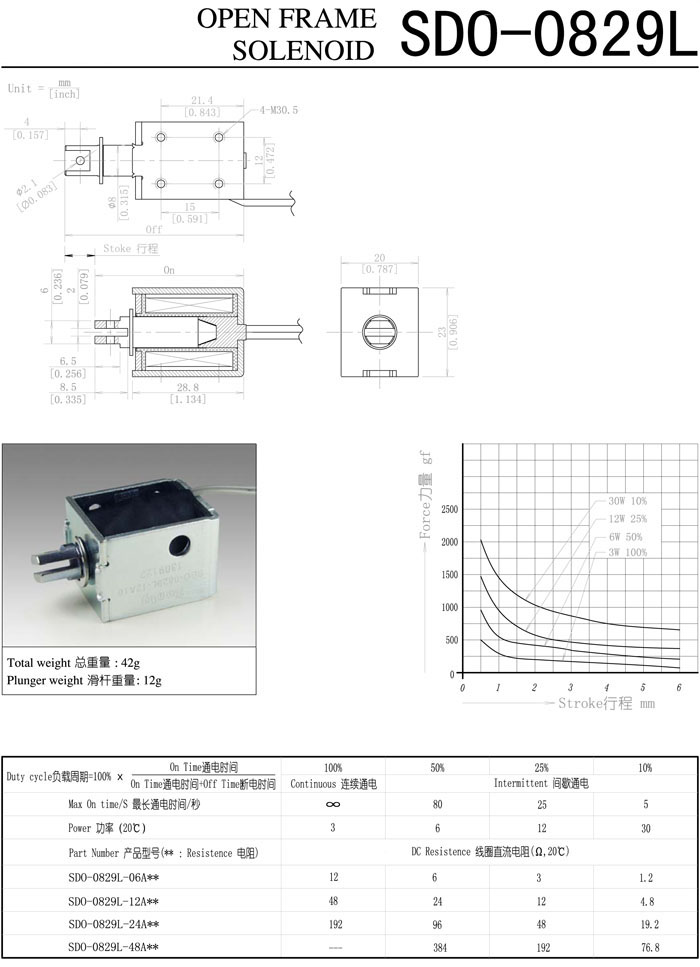 SDO-0829L-06A,SDO-0829L-12A,SDO-0829L-24A,SDO-0829L-48A,直動電磁鐵
