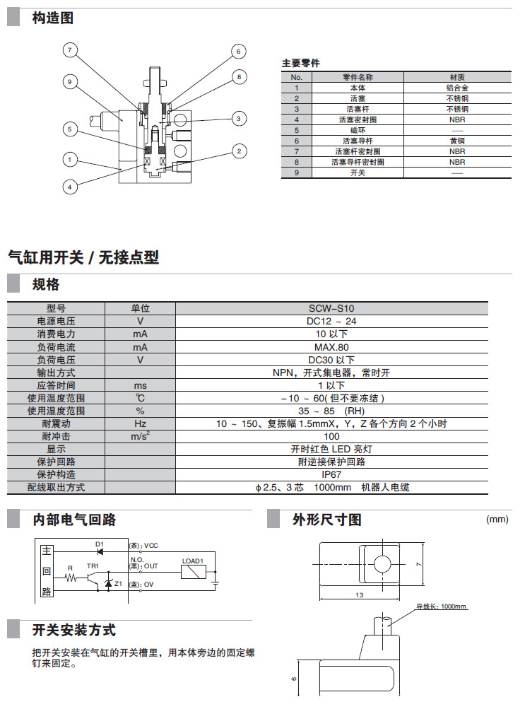 SCW-4.5×3,SCW-4.5×6,SCW-6×4,SCW-6×8,SCW-8×4,SCW-8×8,SCW-10×5,超小型塊狀氣缸