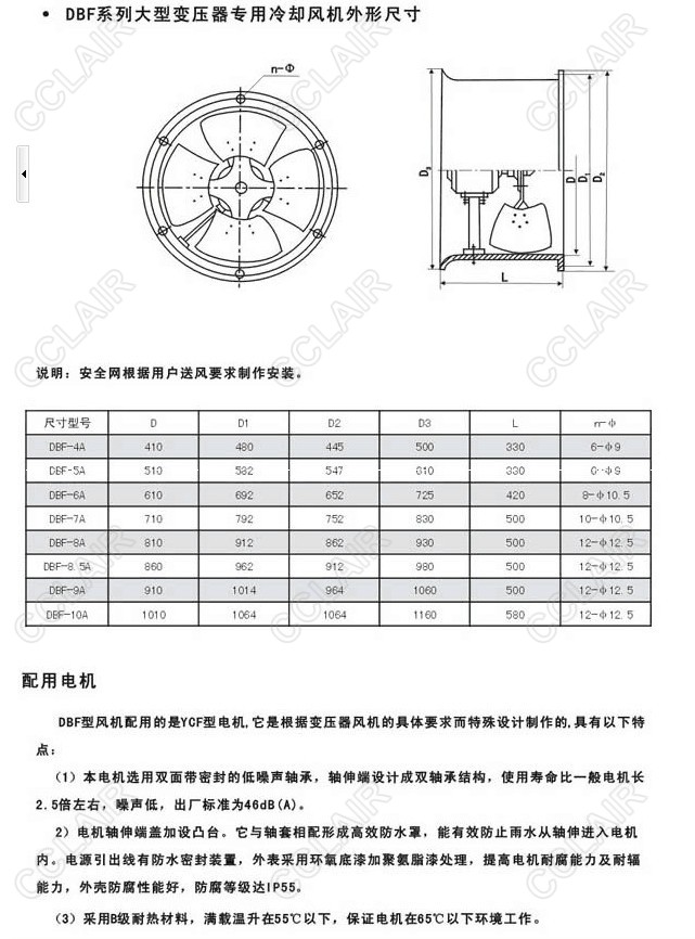 該系列產(chǎn)品規(guī)格品種齊全,覆蓋φ350~φ1200風(fēng)扇直徑,流量3100m3/h~18500 m3/h,全壓30Pa~230Pa,噪聲50dB(A)~75 dB(A)各種規(guī)格產(chǎn)品,廣泛適用于變壓器散熱器、冷卻器的配套使用。