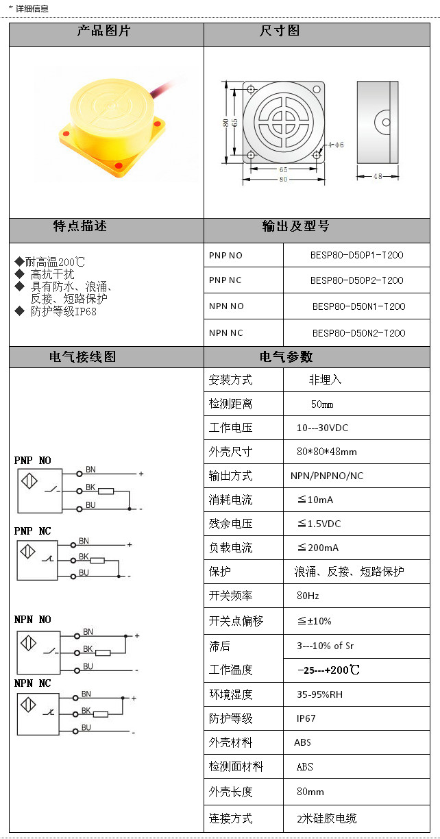 BESP80-D50P1-T200,BESP80-D50P2-T200,BESP80-D50N1-T200,BESP80-D50N2-T200,SP80耐高溫200℃接近開關