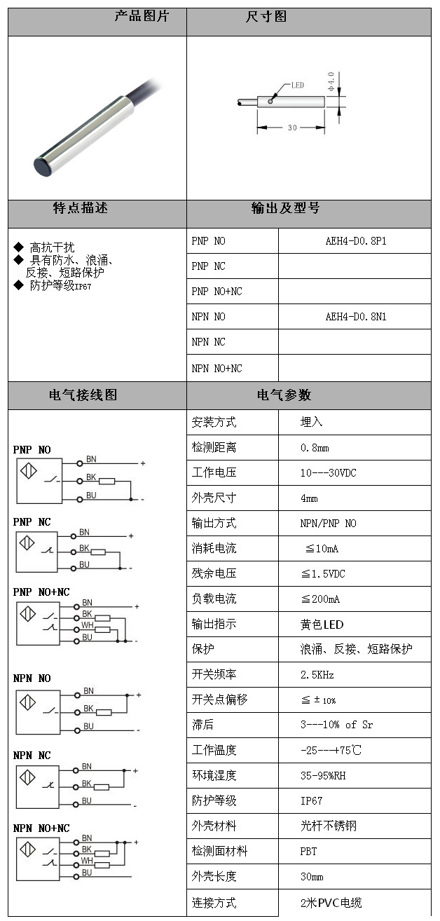 AEH4-D0.8P1,AEH4-D0.8N1,Φ4直流三線電感式接近開關(guān)