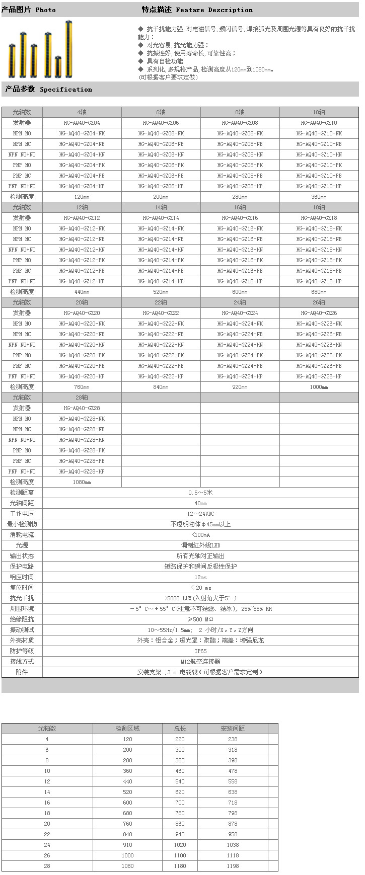 安全光幕傳感器,HG-AQ40-GZ04,HG-AQ40-GZ06,HG-AQ40-GZ08,HG-AQ40-GZ10,