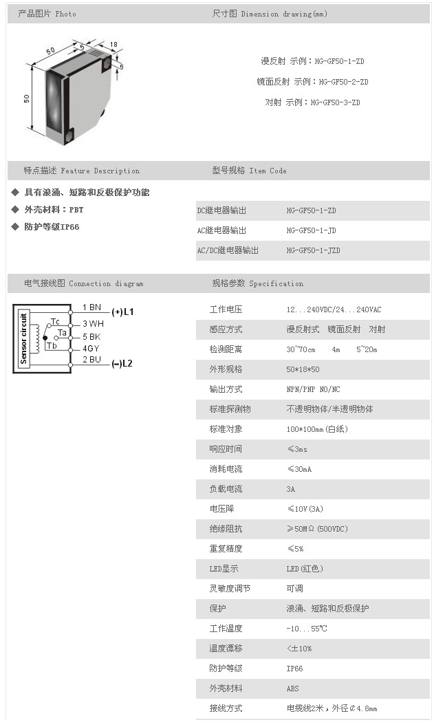 方型光電開關/傳感器 HG-GF50-1-ZD,HG-GF50-1-JD,HG-GF50-1-JZD,