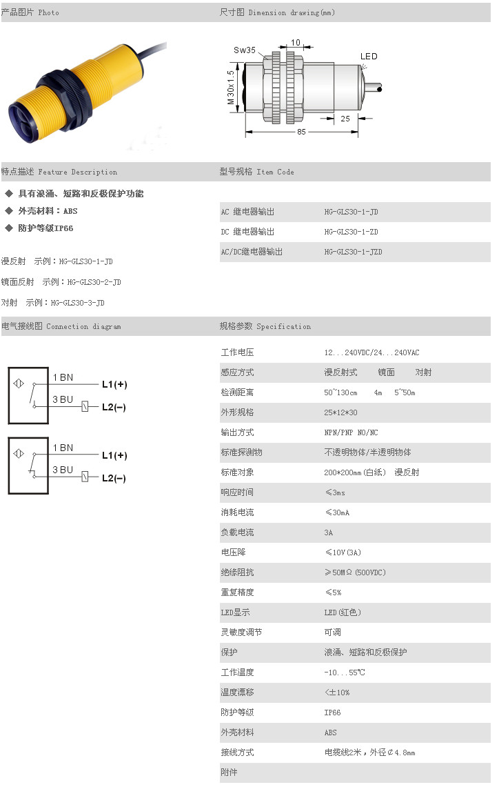 圓柱型光電開關(guān)/傳感器 HG-GLS30-1-JD,HG-GLS30-1-ZD,HG-GLS30-1-JZD,