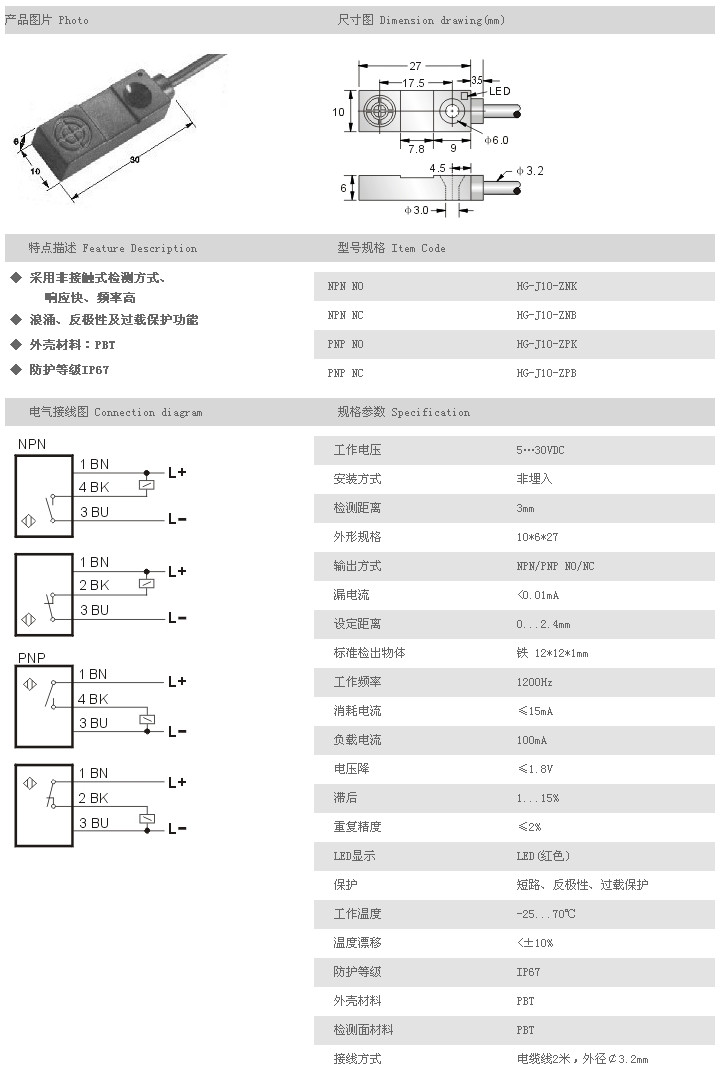 超小型接近開關(guān) HG-J10-ZNK,HG-J10-ZNB,HG-J10-ZPK,HG-J10-ZPB,