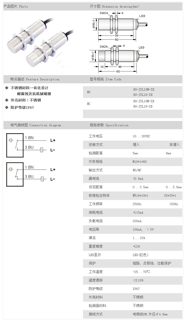 金屬探頭型接近開關 HG-JSL18M-ZK,HG-JSL18-ZK,HG-JSL18M-ZB,HG-JSL18-ZB,