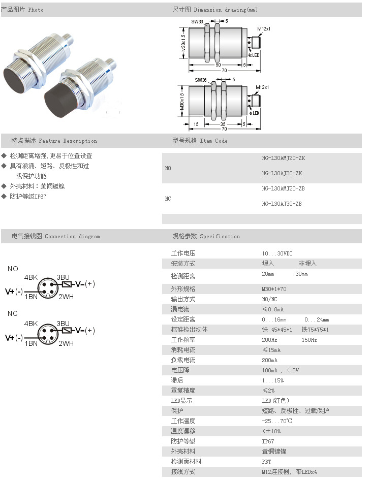 遠(yuǎn)距離型接近開關(guān) HG-L30AMJ20-ZK,HG-L30AJ30-ZK,HG-L30AMJ20-ZB,HG-L30AJ30-ZB,