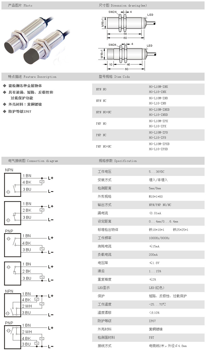 L18圓柱型接近開關 HG-L18M-ZNK,HG-L18-ZNK,HG-L18M-ZNB,HG-L18-ZNB,HG-L18M-ZNKB,