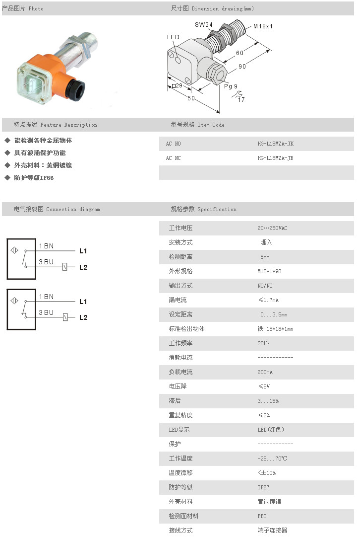 L18MZA圓柱型接近開(kāi)關(guān) HG-L18MZA-JK,HG-L18MZA-JB,