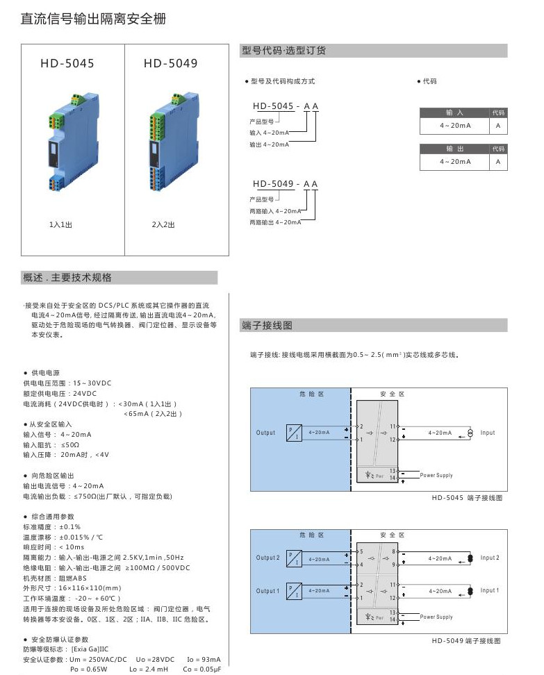 HD-5045-AA,HD-5049-AA,HD-5045,HD-5049,直流信號輸出隔離安全柵
