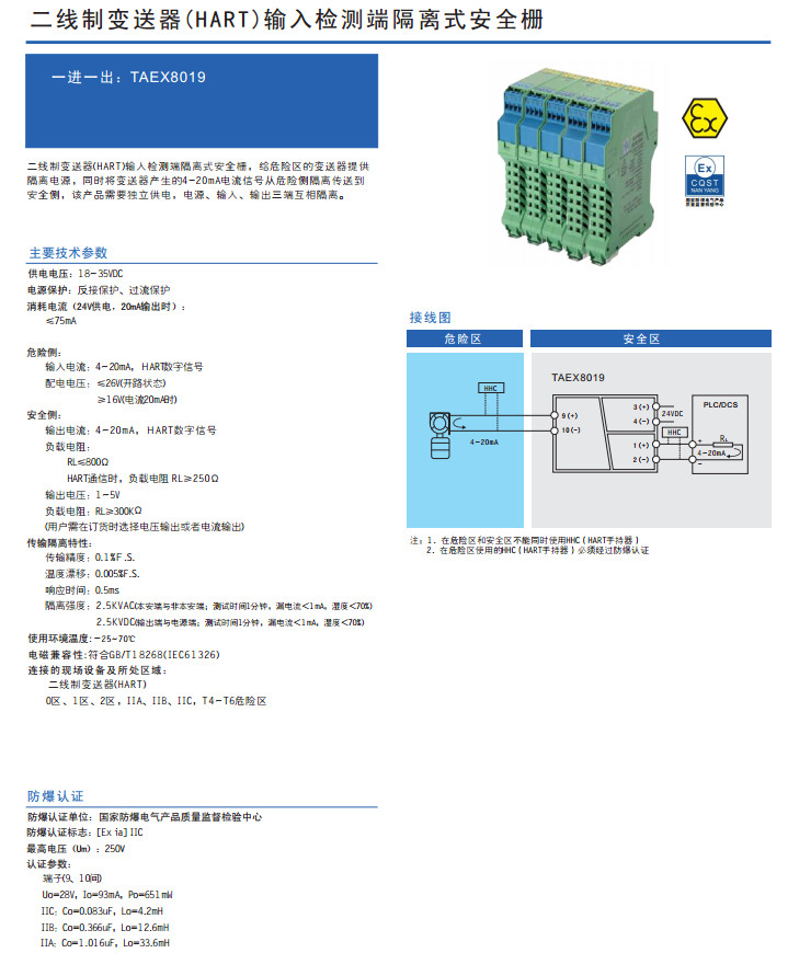 TAEX8019,二線制變送器輸入檢測(cè)端隔離式安全柵