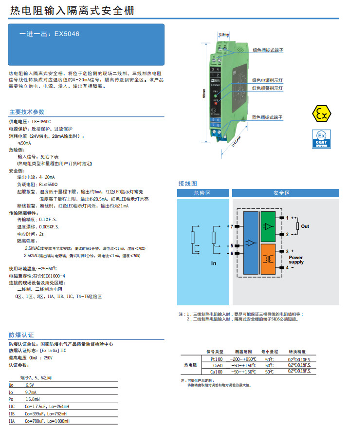 EX5046,熱電阻輸入隔離式安全柵