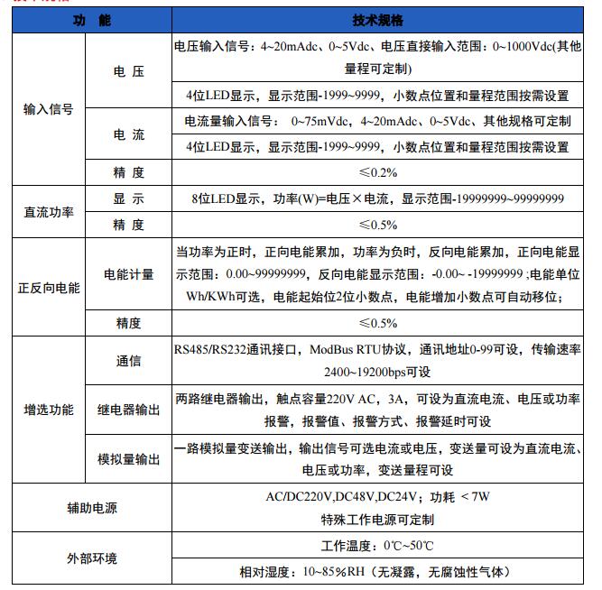 描述:此產(chǎn)品為0~100Adc直流電流信號(hào)經(jīng)過(guò)分流器轉(zhuǎn)換成0~75mVdc信號(hào)作為直流電流信號(hào)輸入,0-100Vdc直流電壓信號(hào)直接輸入,8位LED切換顯示實(shí)時(shí)功率和正反向電能值,4位LED切換顯示實(shí)時(shí)電流值和電壓值,RS485通訊輸出,Modbus-RTU協(xié)議;輔助電源為AC/DC85~265V。