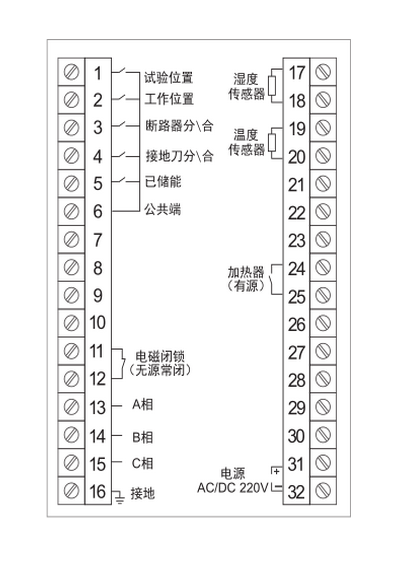 斷路器位置指示(無(wú)源觸點(diǎn)輸入):工作位置觸點(diǎn)閉合時(shí),紅色模擬條亮,試驗(yàn)位置觸點(diǎn)閉合時(shí),綠色模擬條亮;