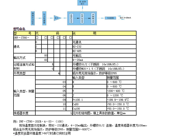 SWP-CT80溫度現(xiàn)場(chǎng)變送控制器是本公司推出新一代先進(jìn)的現(xiàn)場(chǎng)變送單元。該變送器采用先進(jìn)的低功耗CPU配合大屏幕LCD顯示,采用鋰電池供電,可提供長(zhǎng)達(dá)二年以上的連續(xù)工作時(shí)間,免維護(hù)。采用鋁合金外殼進(jìn)口的高精度的鉑電阻傳感器或熱電偶傳感器,抗腐蝕,抗過載,穩(wěn)定性好,精度高,集測(cè)量顯示變送,控制,通訊為一體??蓱?yīng)用于石油,化工、冶金等部門各種腐蝕和非腐蝕性液體和氣體測(cè)量與控制。