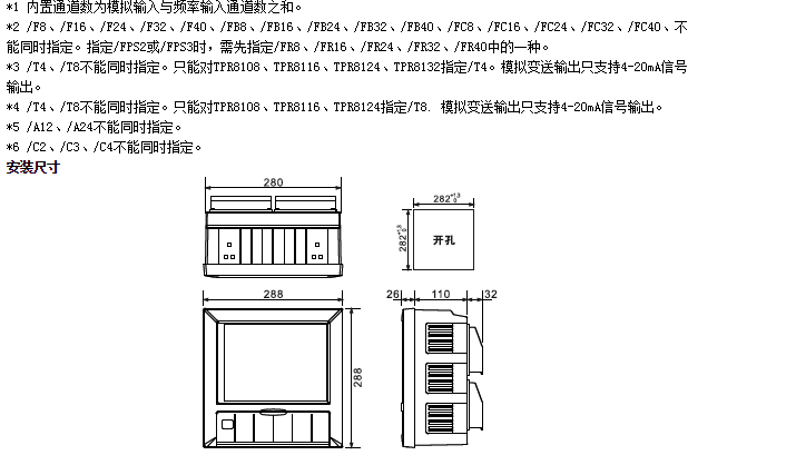 | ●報(bào)警輸出繼電器(/A12,/A24): 輸出點(diǎn)數(shù):從12、24點(diǎn)中選擇。 ●通信功能(/C2,/C3) 媒體:RS-232(/C2)或RS-485(/C3) 協(xié)議:Modbus-RTU(從機(jī))協(xié)議 通信速率:1200/2400/4800/9600/19200/38400/57600 ●打印功能(/C4) 打印機(jī):面板式微型打印機(jī)。 打印內(nèi)容:實(shí)時(shí)數(shù)據(jù)、歷史數(shù)據(jù)、累積報(bào)表。 打印方式:手工打印、定時(shí)打印。 ●模擬輸出(/T4,/T8) 信號(hào)類型:4-20mA 輸出點(diǎn)數(shù):從4,8點(diǎn)中選擇。 輸出方式:測(cè)量通道的變送輸出。 最大負(fù)載:750Ω ●24VDC變送器電源輸出(TP8): 輸出點(diǎn)數(shù):8回路。 輸出電壓:24VDC。 額定輸出電流:4~20MADC。 最大輸出電流:65mAdc(過(guò)電流保護(hù)動(dòng)作電流:約90mA) |