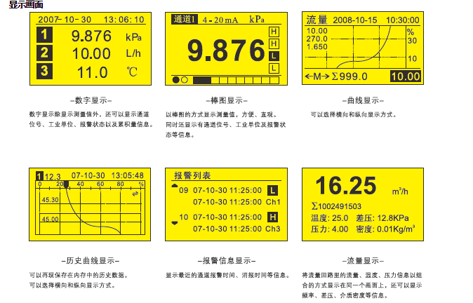 顯 示:發(fā)生報警時,測量數(shù)據(jù)顯示畫面都有報警狀態(tài)顯示。