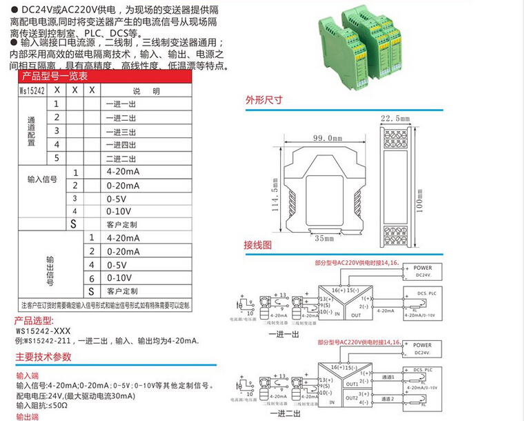 WS15241信號隔離器,WS15242信號分配器,信號轉換模塊,全隔離輸出信號分配器 隔離柵,信號隔離器模塊,安全柵,電流轉換模塊。將輸入信號變換為兩路相互隔離的信號,低功耗,低熱量,低漂移,DIN T型導軌安裝