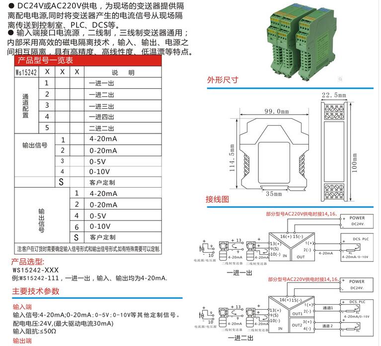 WS15242全隔離雙輸出信號分配器,將輸入信號變換為兩路相互隔離的信號,低功耗,低熱量,低漂移,DIN T型導(dǎo)軌安裝