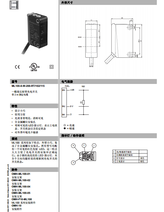 ML100-8-W-200-RT-102-115,漫反射型傳感器