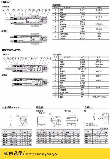 RB0604,RB0805,RB0806,RB1006,RB1007,RB1210,RB1411,RB1412,RB2015,RB2525,RB2725油壓緩沖器
