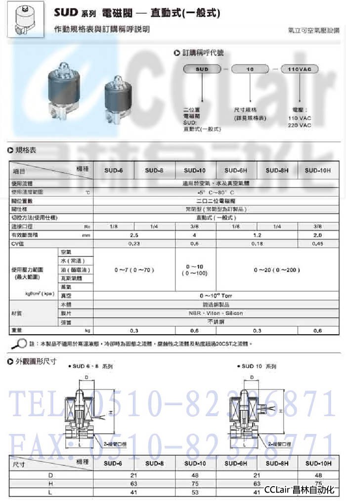 SUD-6,SUD-8,SUD-10,SUD-6H,SUD-8H,SUD-10H,直動式電磁閥