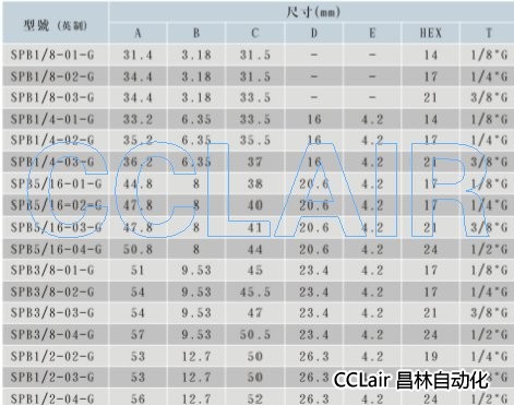 SPB1/8-01-G,SPB1/4-02-G,SPB5/16-01-G,SPB3/8-01-G,SPB3/8-03-G,SPB1/2-04-G,接頭