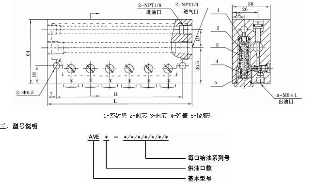 | 從進(jìn)油口處進(jìn)入的壓力油,在油壓的作用下件1下移,緊貼在件2上端面封住了通油通道,同時(shí)打開了進(jìn)油通道向件3上腔充油,件3在油壓作用下克服件4彈簧力向下移動(dòng),則件3下腔的油頂開件5進(jìn)入混合腔,在壓縮空氣的作用下經(jīng)混合后的油氣從油氣出口排出。供油主管卸荷后,件1上部油壓低并且件3在件4的作用下向上回位,件3上腔充入的油經(jīng)已打開的件2上端面流道孔進(jìn)入件3下腔儲(chǔ)存,為下一循環(huán)供油作好準(zhǔn)備。各口的供氣量可通過節(jié)流螺絲的開口大小進(jìn)行調(diào)節(jié)。 |