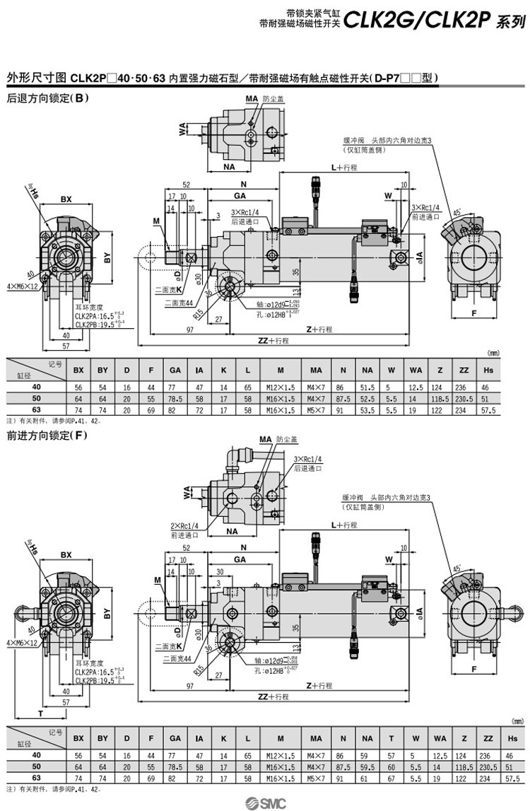 CLK2PA40-50,CLK2PA50-50,CLK2PA63-50,CLK2PB40-50,CLK2PB50-50,CLK2PB63-50,SMC帶鎖夾緊氣缸