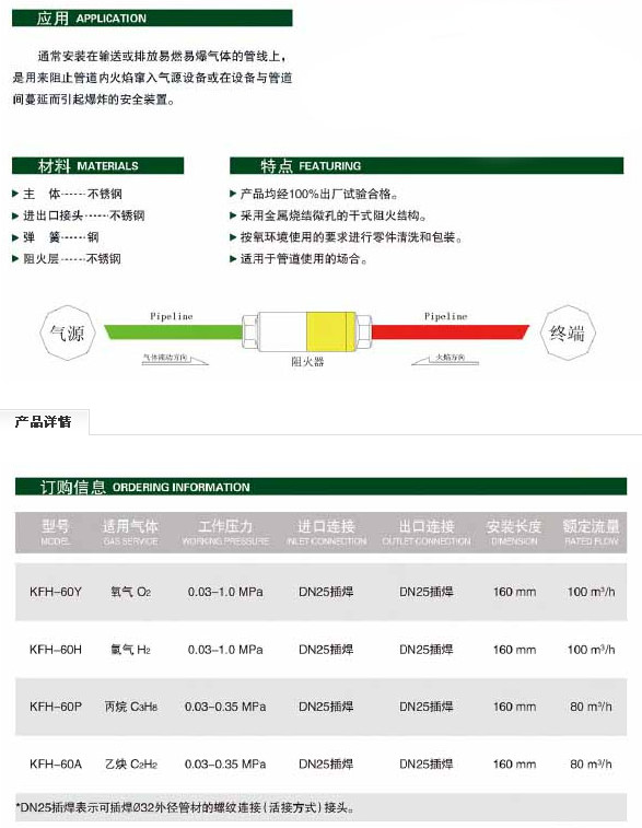 詳細(xì)信息 KFH-60Y,KFH-60H,KFH-60P,KFH-60A,阻火器/回火防止器