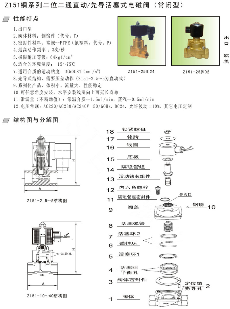 Z151-2.5,Z151-05,Z151-10,Z151-15,Z151-20,Z151-10-64,先導(dǎo)活塞式電磁閥