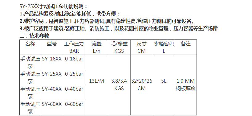 手動(dòng)管道試壓泵SY-16XX,SY-25XX,SY-40XX,SY-60XX