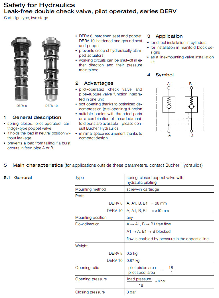 詳細信息 DERV-8-N,DERV-8-T,DERV-8-V,DERV-10-N,DERV-10-T,DERV-10-V,Bucher雙先導(dǎo)式止回閥