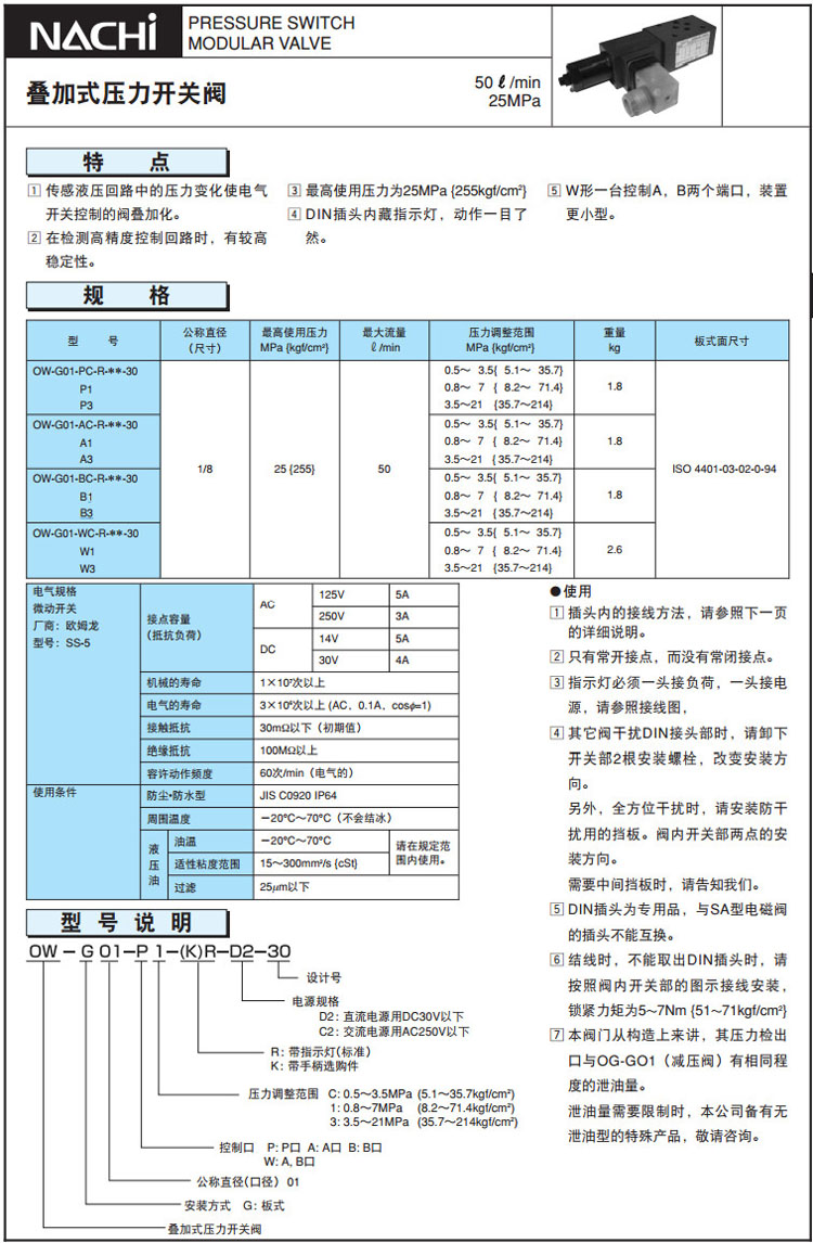 OW-G01-PC-R-D2-30,OW-G01-A1-R-C2-30,OW-G01-B3-R-C2-30,OW-G01-W3-R-D2-30,NACHI疊加式壓力開關(guān)閥