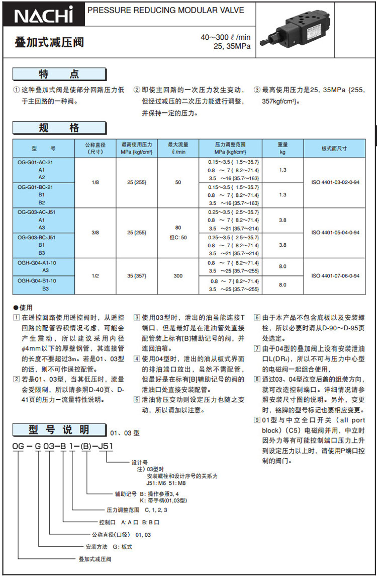 詳細(xì)信息 OG-G01,OG-G03,OGH-G04,OG-G01-AC-21,OG-G03-AC-J51,OGH-G04-B3-10,NACHI疊加式減壓閥