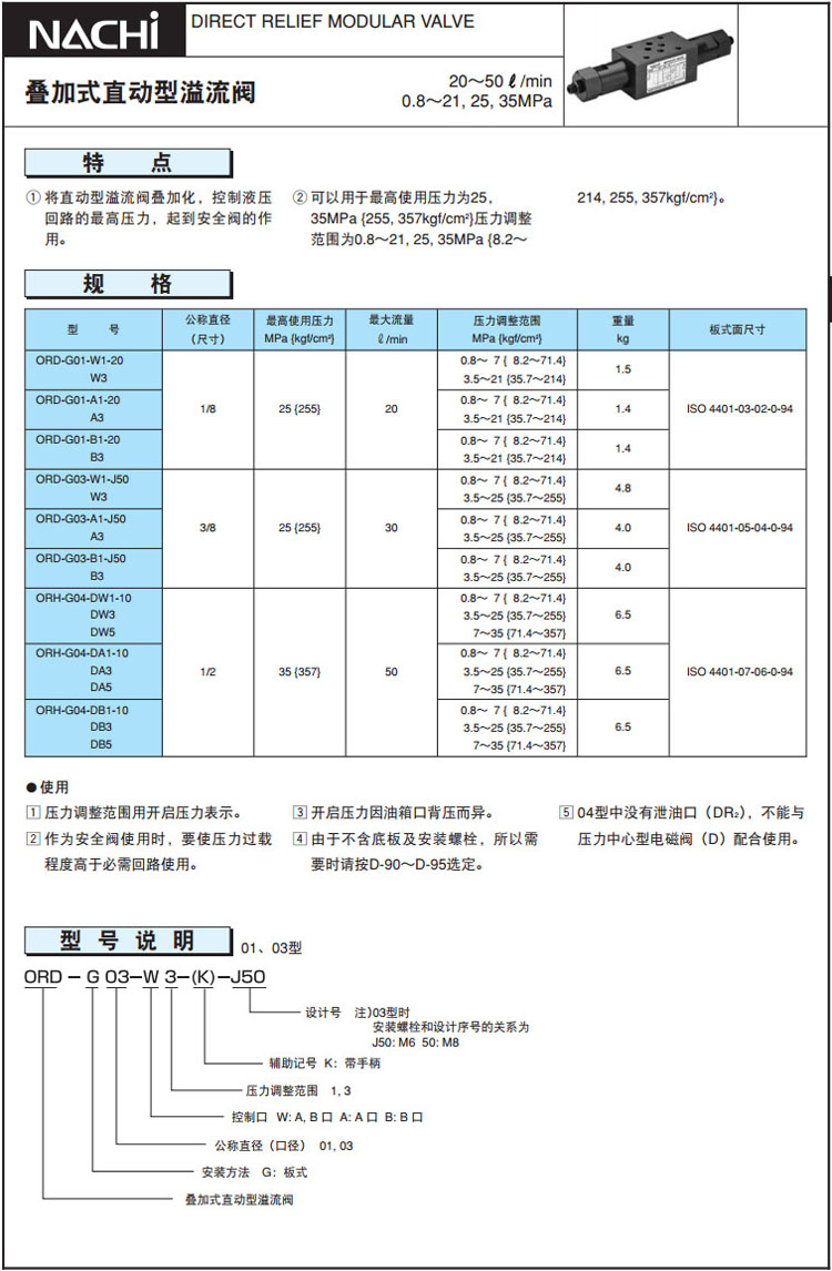 ORD-G01,ORD-G03,ORH-G04,ORD-G01-W1-20,ORD-G03-W1-J50,ORH-G04-DW1-10,NACHI疊加式直動型溢流閥