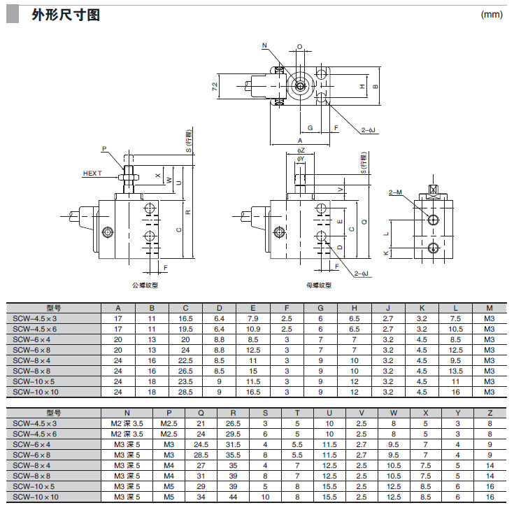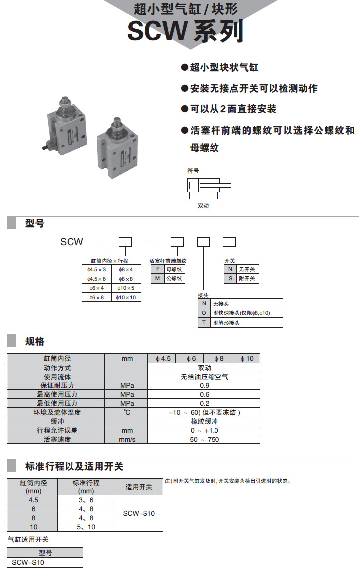 SCW-4.5×3,SCW-4.5×6,SCW-6×4,SCW-6×8,SCW-8×4,SCW-8×8,SCW-10×5,超小型塊狀氣缸