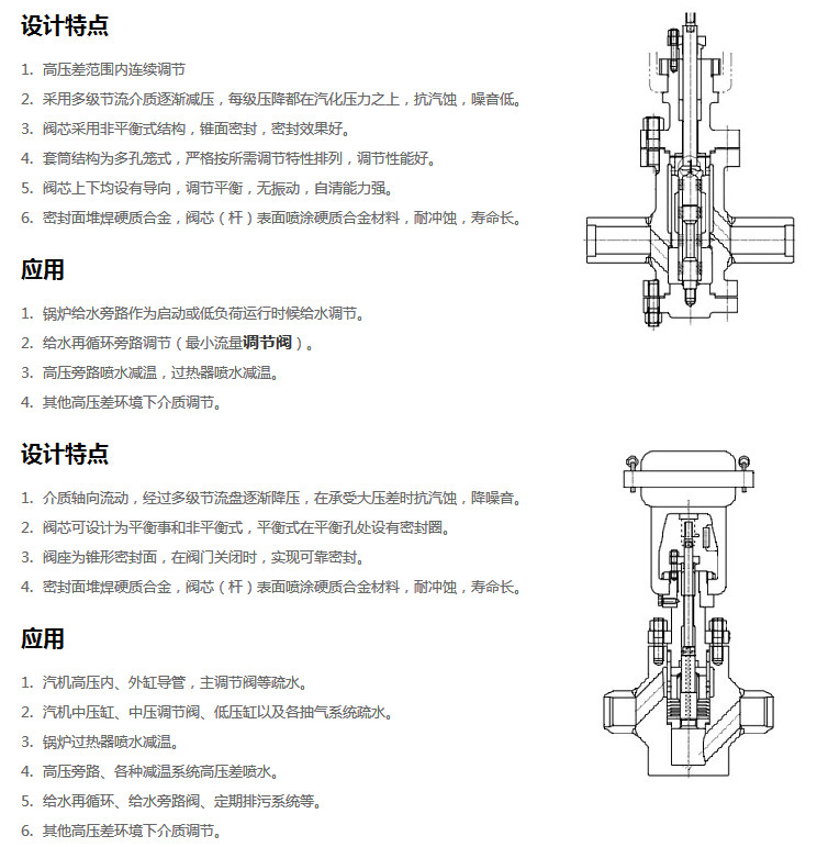 ZHD電子式電動(dòng)多級(jí)調(diào)節(jié)閥采用的是多級(jí)籠式套筒閥芯或軸流迷宮型閥芯,多級(jí)減壓,完全控制流過(guò)閥內(nèi)的介質(zhì)的流速,大幅度的降低了高壓氣體或者蒸汽在閥內(nèi)產(chǎn)生的噪音,穩(wěn)定的多級(jí)別降壓有效使液體不會(huì)產(chǎn)生氣蝕,是使用在高壓介質(zhì)場(chǎng)所性能穩(wěn)定的控制閥,可選擇多彈簧氣動(dòng)薄膜機(jī)構(gòu)或電動(dòng)執(zhí)行機(jī)構(gòu)等。