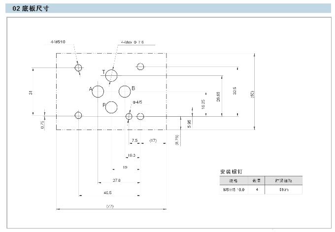 規(guī)格 02 03 最高工作壓力 (MPa) 油口P,A,B 31.5 油口T 10 工作介質(zhì) 礦物質(zhì)液壓油;磷酸脂 介質(zhì)溫度范圍 (℃) -20~70 介質(zhì)粘度范圍 (mm2/s) 2.8~380 滯環(huán) (%) <5 重復(fù)精度 (%) <2 工作電壓 ( V) DC24 額定電流 (mA) 750 1500 線圈電阻 (Ω) 19.5 10 防護(hù)等級 IP55