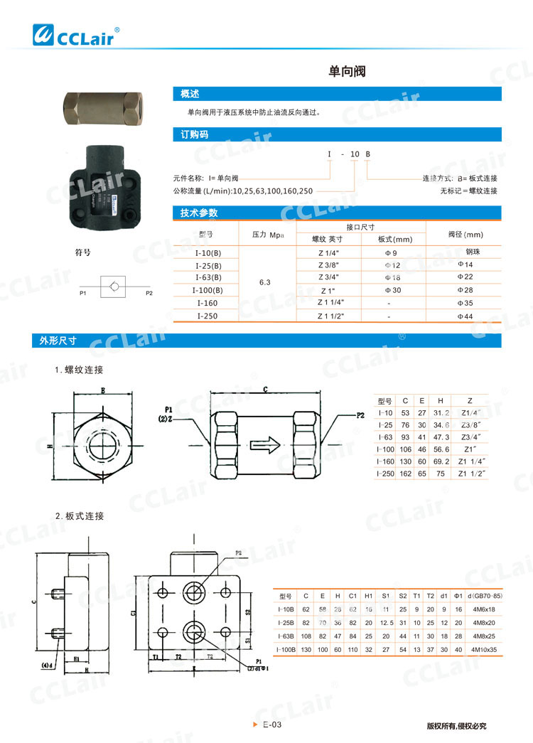 I-10,I-25,I-63,I-100,I-10B,I-25B,I-63B,I-100B,I-160,I-250,單向閥