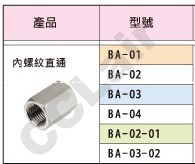 BA-01,BA-02,BA-03,BA-04,BA-02-01,BA-03-02,國(guó)鷹KUOIN內(nèi)螺紋直通接頭