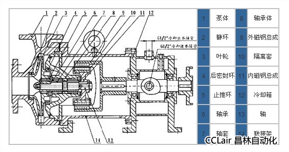 CQB-G型高溫磁力驅(qū)動泵(簡稱高溫磁力泵)通常由電機(jī),磁力耦合器,水冷卻裝置和耐腐蝕離心泵四大部分組成,其主要特點(diǎn)是利用磁力耦合器傳遞動力。當(dāng)電動機(jī)帶動磁力耦合器的外磁鋼旋轉(zhuǎn)時,磁力線穿過間隙和隔離套,作用于內(nèi)磁鋼上,使泵轉(zhuǎn)子與電動機(jī)同步旋轉(zhuǎn),無機(jī)械接觸地傳遞扭矩。在泵的動力輸入端,由于液體被封閉在靜止的隔離套內(nèi),沒有動密封因而無泄漏。磁力耦合器的磁性材料采用耐高溫型稀土永磁材料,能承受280度以下的高溫介質(zhì)而保持強(qiáng)大的磁力扭矩。在電機(jī)與磁力耦合器之間加裝了水冷卻裝置,防止泵送高溫介質(zhì)之熱量傳導(dǎo)至電機(jī),以保持電機(jī)的正常運(yùn)行,從而達(dá)到無泄漏輸送高溫介質(zhì)。