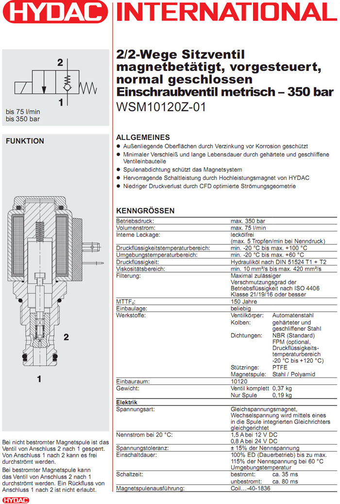 首頁(yè) > 產(chǎn)品&解決方案 > WSM10120Z-01-C-N-24DG,WSM10120Z-01-C-N-230AG,HYDAC電磁2/2方向座閥
