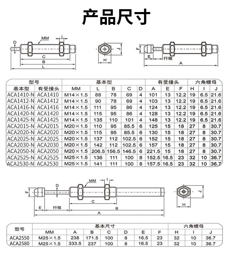 詳細(xì)信息 油壓緩沖器ACA0806,ACA1007,ACA1210,ACA1215,ACA1412,ACA1416,ACA1420,ACA1616,ACA1620,ACA1625,ACA2020,ACA2025,ACA2030,ACA2040,ACA2525,ACA2550,ACA2725,ACA2750,ACA3325,ACA3350,ACA3625,ACA3650氣缸阻尼器