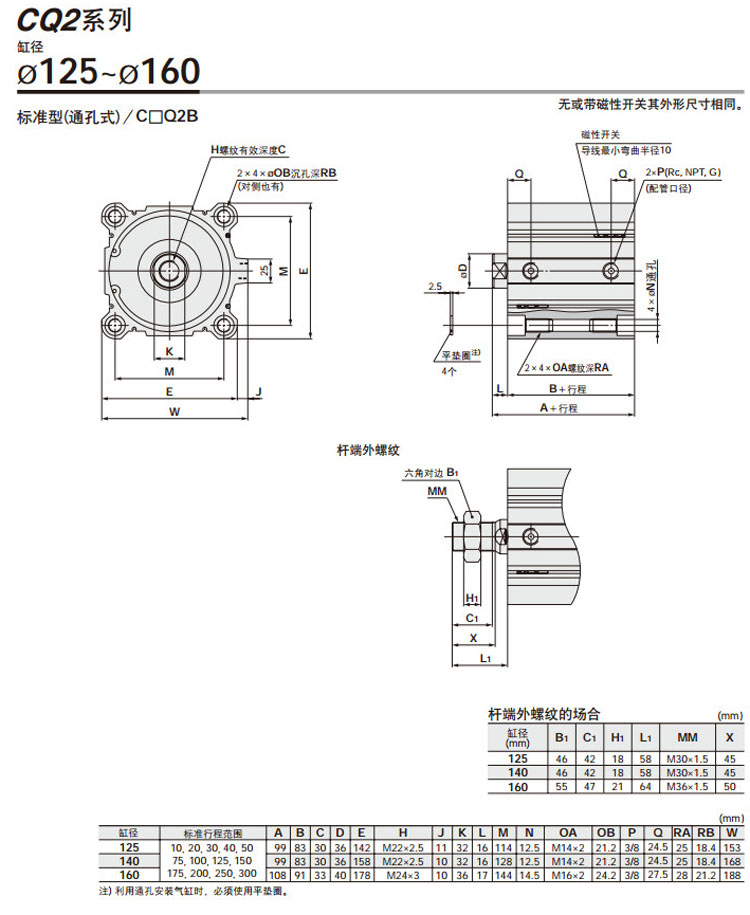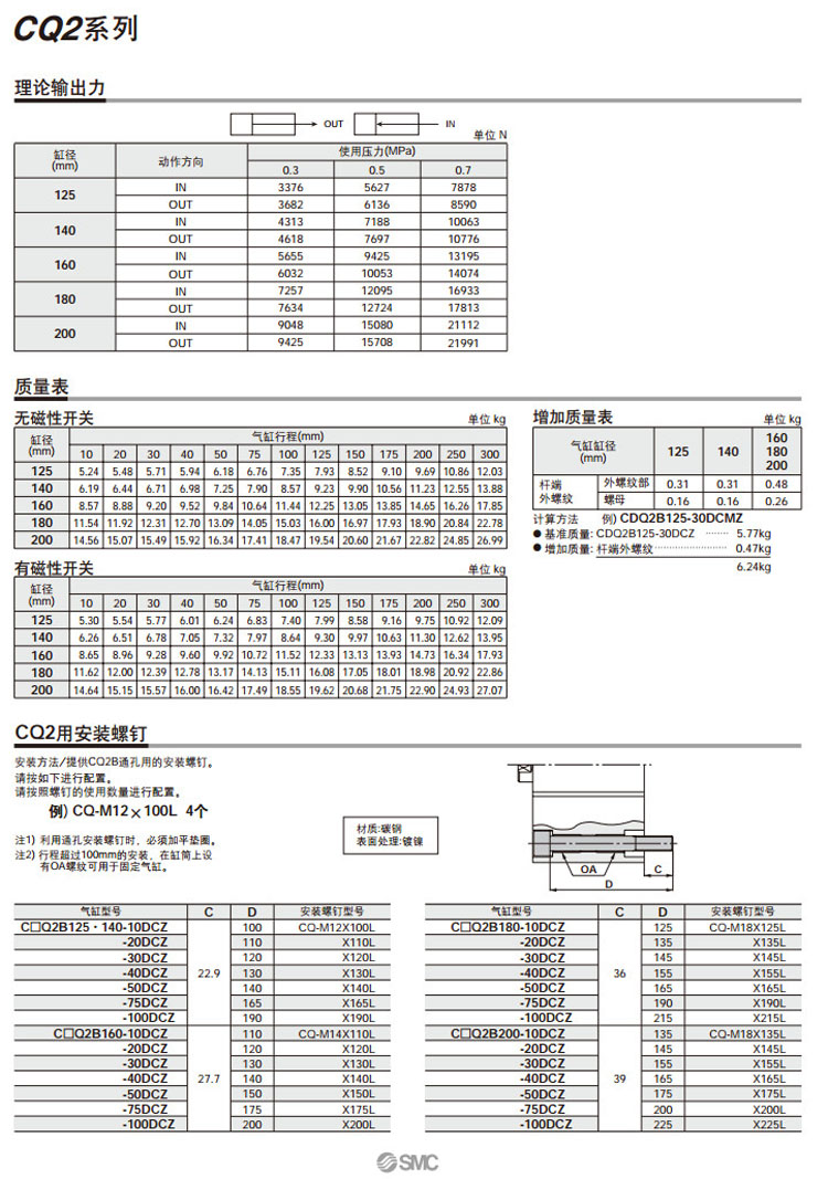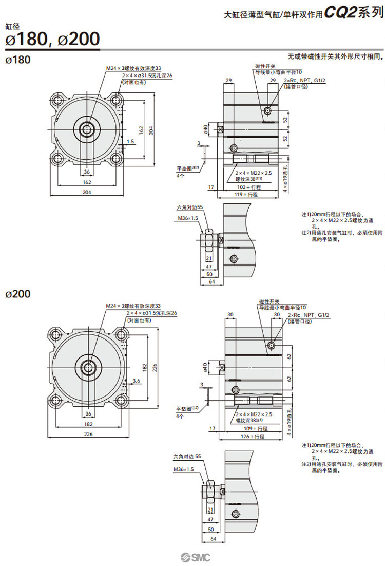 CQ2B125,CQ2B140,CQ2B160,CQ2B180,CQ2B200,CDQ2B125,CDQ2B140,CDQ2B160,CDQ2B180,CDQ2B200,SMC薄型氣缸