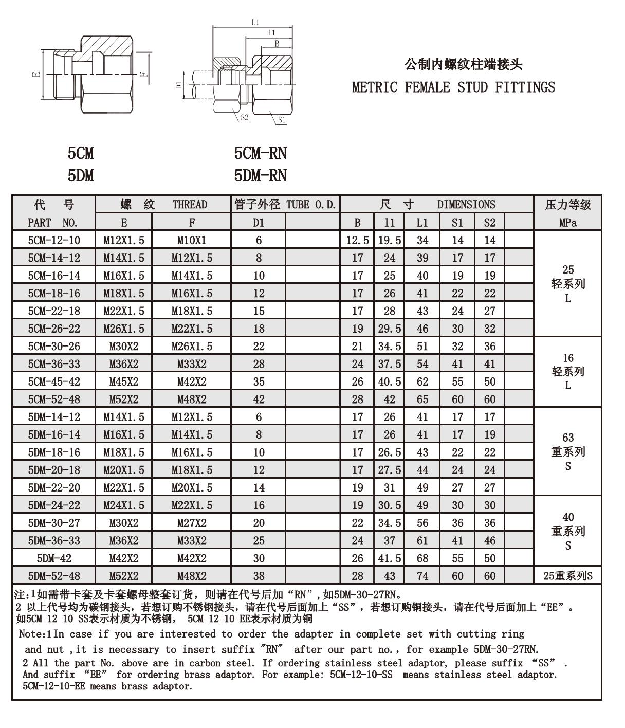 5CM-12-10,5CM-14-12,5CM-16-14,5CM-18-16,5CM-22-18,5DM-30-27,5DM-36-33,5DM-42,公制螺紋卡套接頭