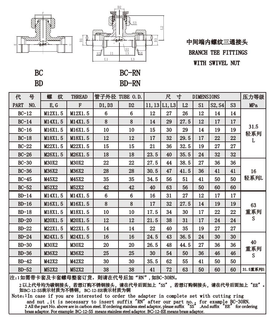 詳細(xì)信息 BC-12,BC-26,BC-30,BC-45,BC-52,BD-18,BD-20,BD-36,BD-42,BD-52,內(nèi)螺紋三通接頭