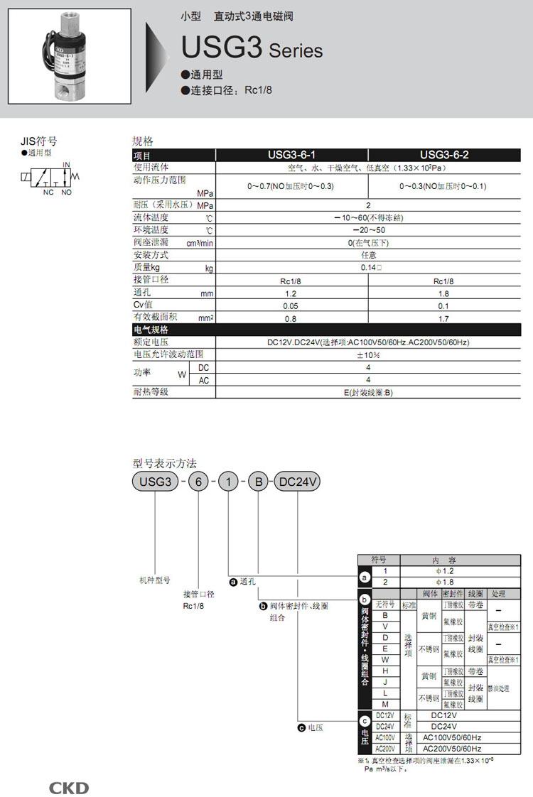 詳細(xì)信息 USG3-6-1,USG3-6-2,CKD直動(dòng)式3通電磁閥